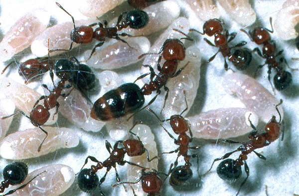 "This ant colony contains several castes including a winged insect (ant or wasp?) and eggs". – Das geflügelte Tier ist ein Männchen;