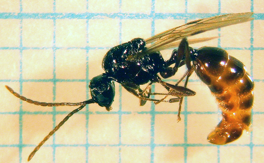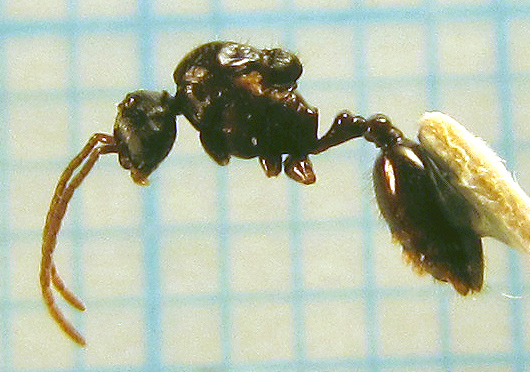 Bei diesem Männchen wurden Flügel und Beine entfernt. Auffallend ist das hoch bucklige Scutellum. In der Einkerbung über dem Epinotum liegt schmal spangenförmig das Metanotum. Das große Scutum des Mesonotums ist etwas eingedellt (Beschädigung).