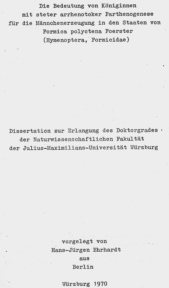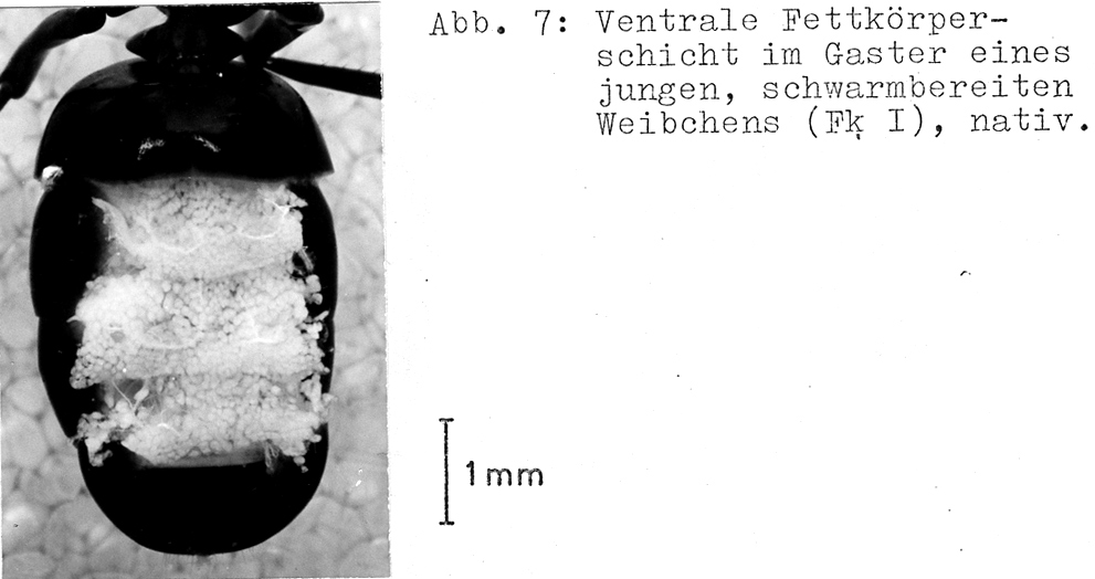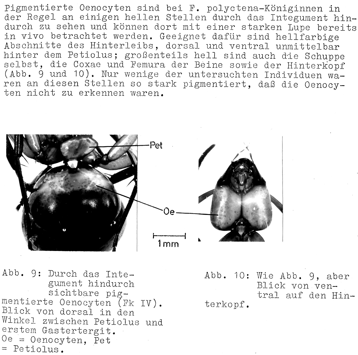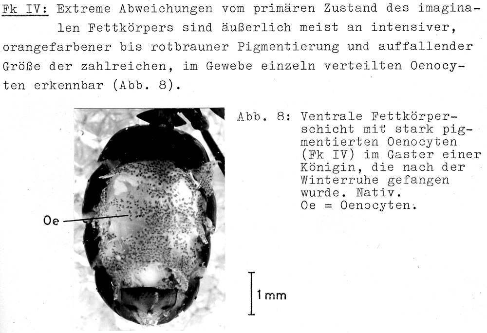 2.) „Altersflecken“: Unter der Cuticula liegen bei jungen Königinnen (und Arbeiterinnen sowie Larven,vgl.) oft von außen erkennbare helle bis weiße Fleckchen. Das sind sog. Oenocyten . Sie werden mit zunehmendem Alter dunkler und schließlich braun. (Bei der fraglichen Königin sind zahlreiche solche braunen Flecken erkennbar). - Hölldobler & Wilson (1970, S. 317) diskutieren die Rolle von Oenocyten bei der Altersbestimmung von Ameisen, mit Bezug auf Daten aus den Dissertationen von Buschinger (1967) und Ehrhardt (1970).