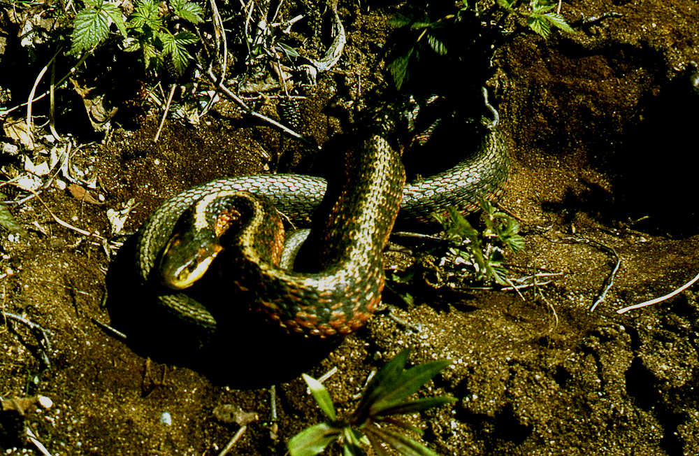 ...schaut Dir eine „Common Garter Snake“ entgegen, Thamnophis sirtalis, eine ungiftige, aber recht aggressive Art. :)