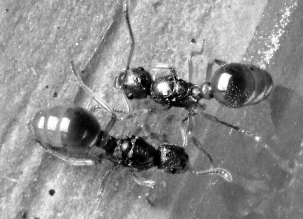 Das Foto zeigt oben die fertile Königin der Parasitenart, darunter die ebenfalls fertile Königin der Wirtsart. Damals konnte ich nur s-w-Fotos anfertigen; Farbdias waren einfach zu teuer. :(