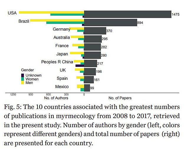 Die Untersuchung befasst sich mit myrmekologischen Veröffentlichungen in zahlreichen Journalen sowie in verschiedenen Ländern. Ein Schwerpunkt ist die Geschlechterverteilung unter den Autoren. Das wird dann auch noch nach den 10 Ländern mit den höchsten Anzahlen myrmekologischer Arbeiten aufgeschlüsselt.