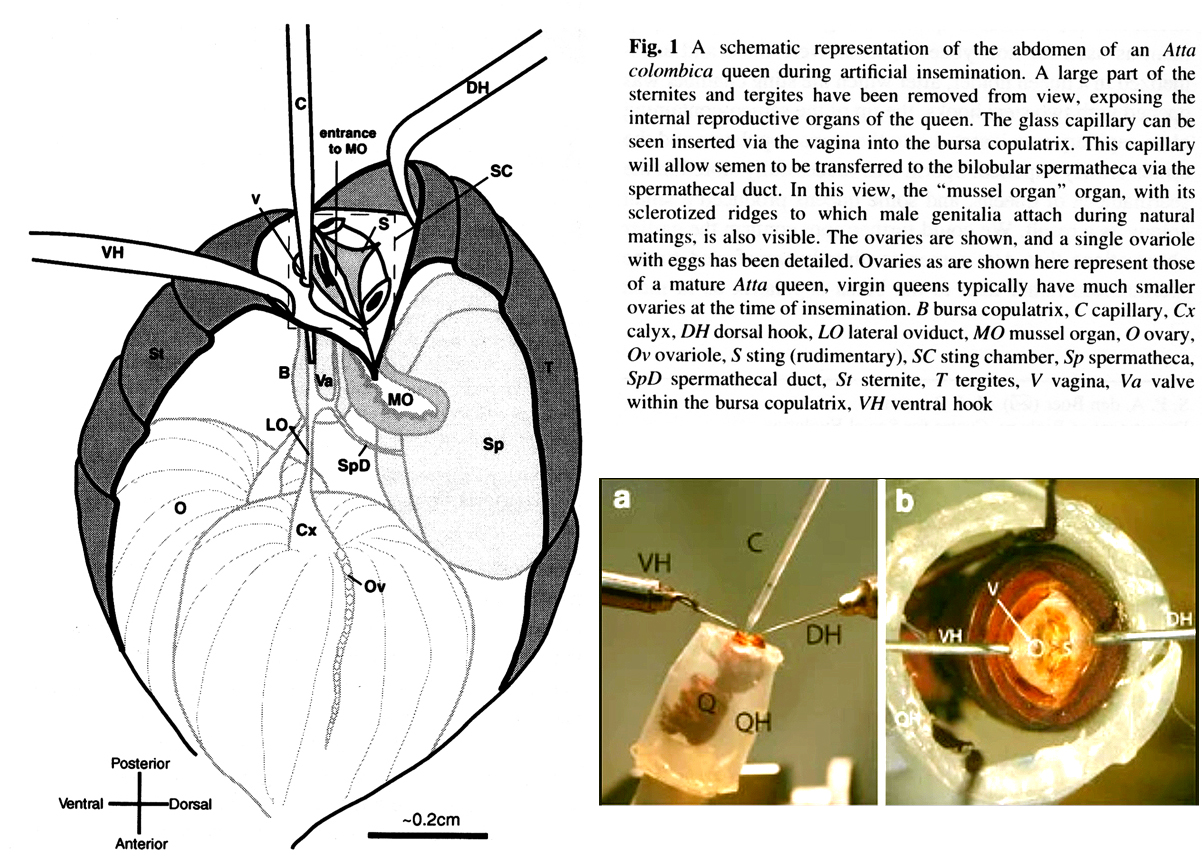 Die Gyne (Q) ist in einer Halterung (QH) festgelegt, wie man in der farbigen Abbildung a erkennen kann. Ein ventraler (VH) und ein dorsaler (DH) Haken halten das Hinterende offen, eine Glaskapillare (C) führt das Sperma durch die Vagina (V) in die Bursa copulatrix (B). Von dort gelangt es durch einen engen Spermagang (SpD) in die sehr große Spermathek (SP). Links unten (hinten) sind die beiden Ovarien angedeutet (O) in denen eine Ovariole (Ov) mit Eizellen deutlicher eingezeichnet ist.