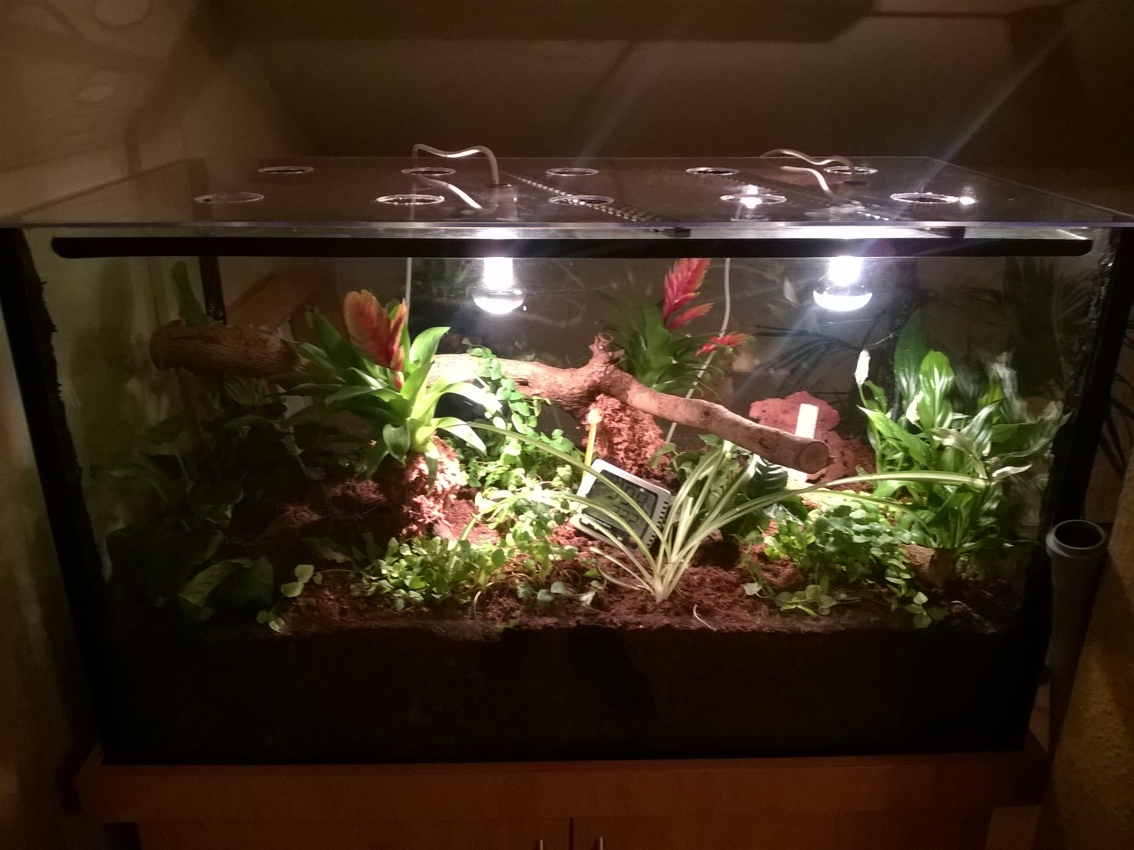 Temperatur liegt im Becken bei ca 25 Grad und unter den Spots bis maximal 30. Luftfeuchtigkeit ist meist bei 99%. Sinkt aber auch schon mal ab auf 93%. Aber schon schön hoch.