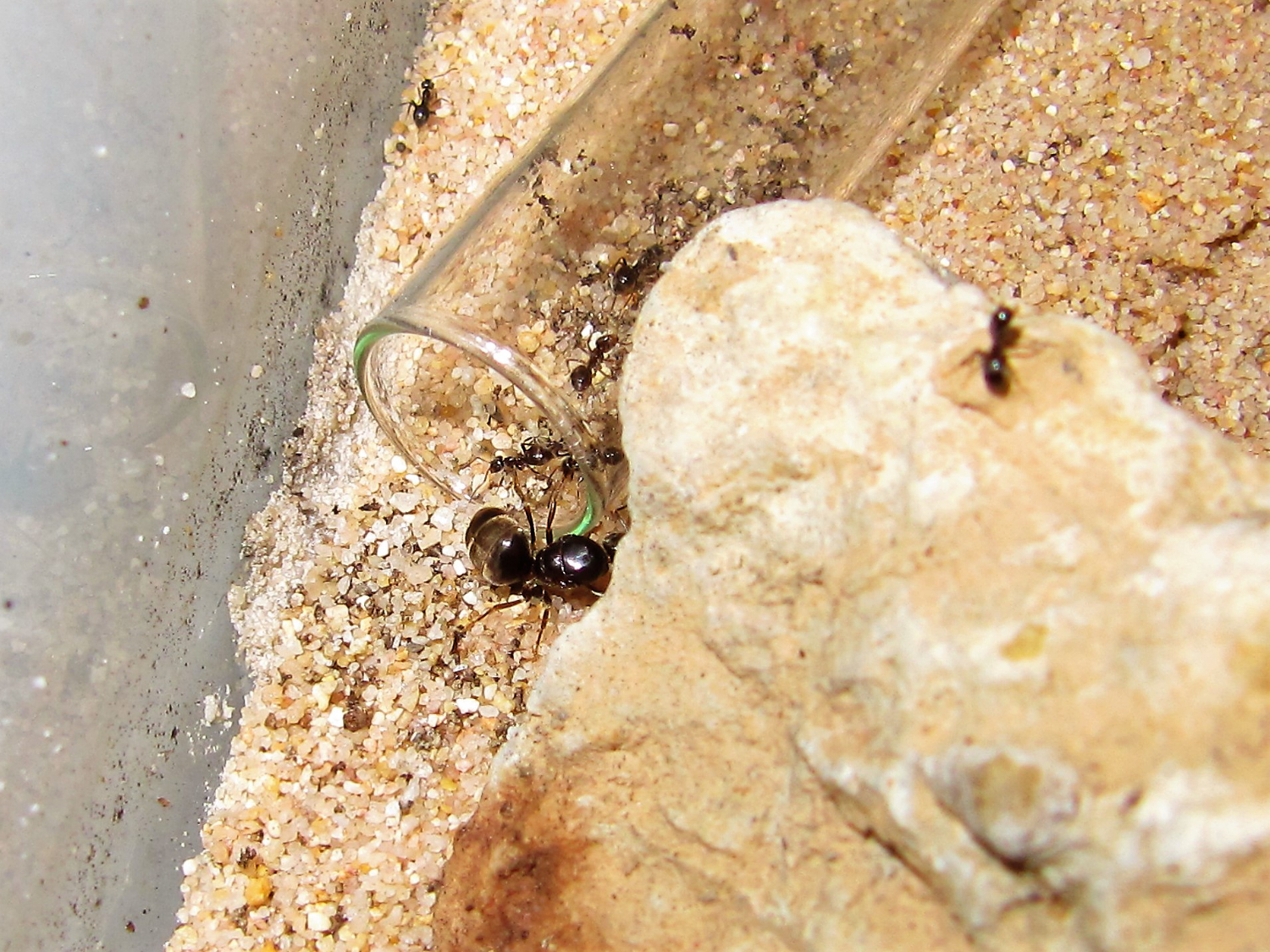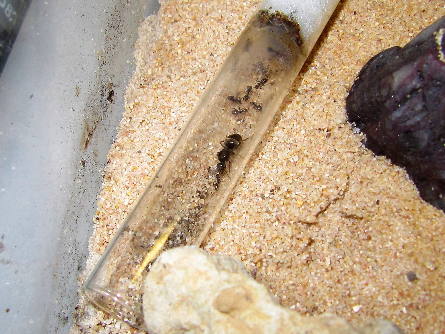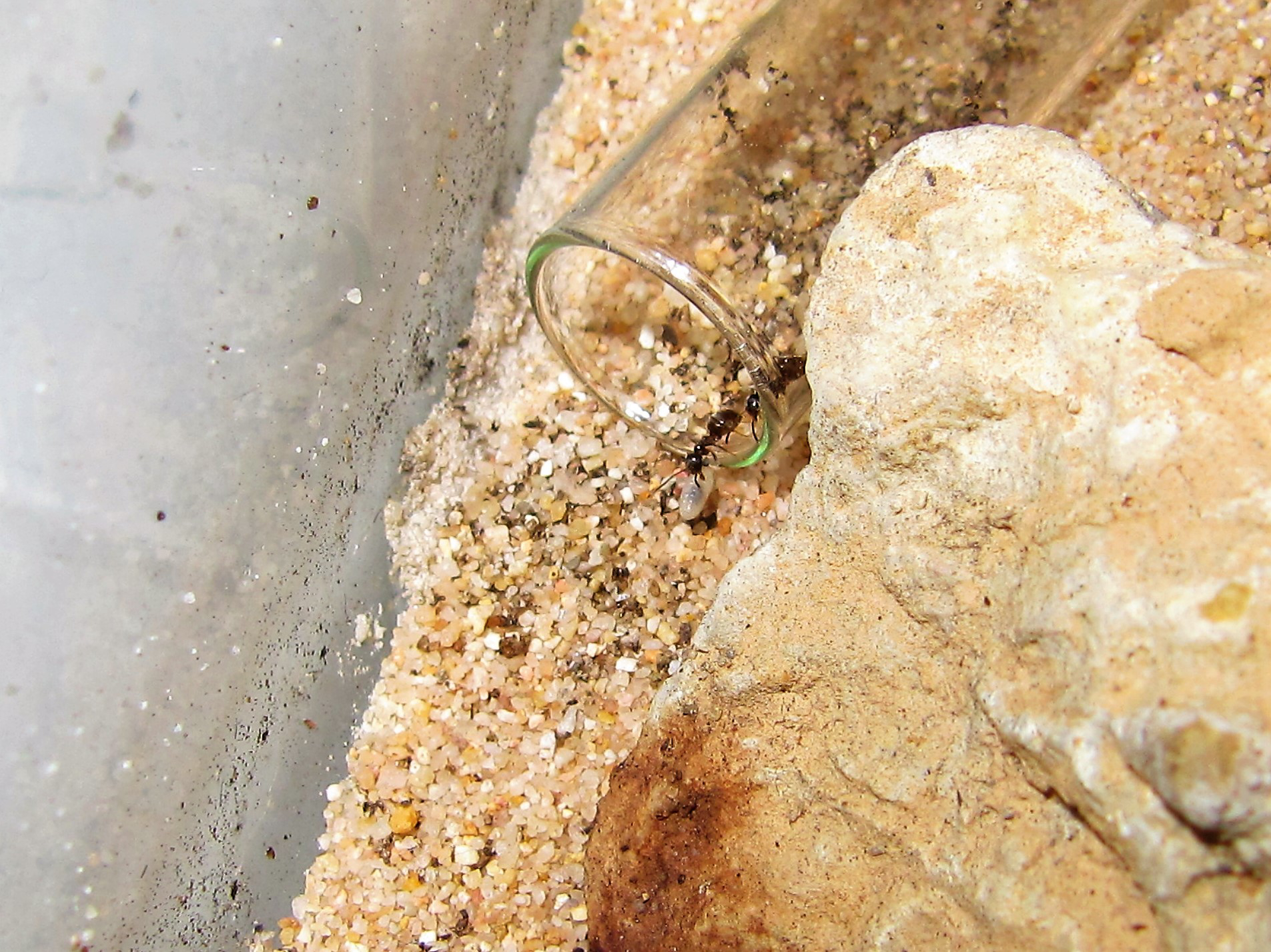 Letzte Woche kamen die Ameisen direkt aus dem Kühlschrank in eine kleine mit Sand gefüllte Arena. Ihr Reagenzglasnest blieb vorerst mit Alufolie abgedunkelt, der Eingang des Nestes mit einem Korkstopfen, der mit einer 4 mm Bohrung versehen ist, verengt. In die Arena kam zudem eine Reagenzglastränke mit Wasser.