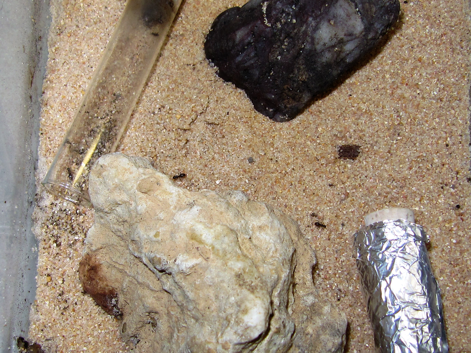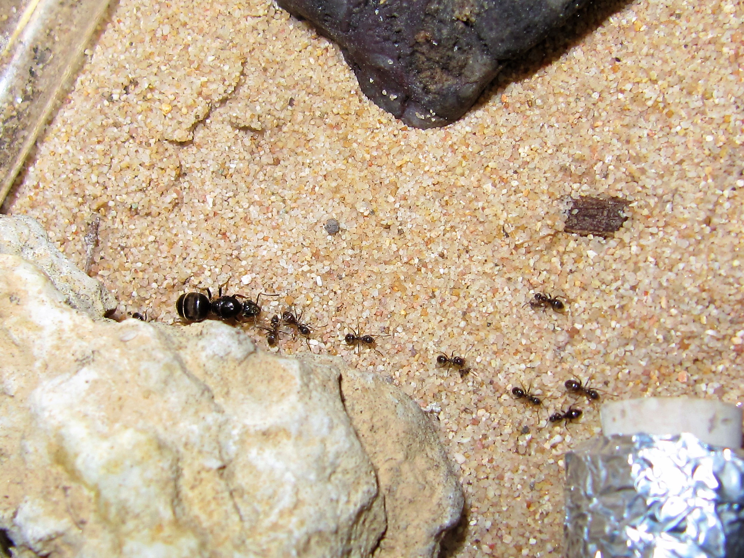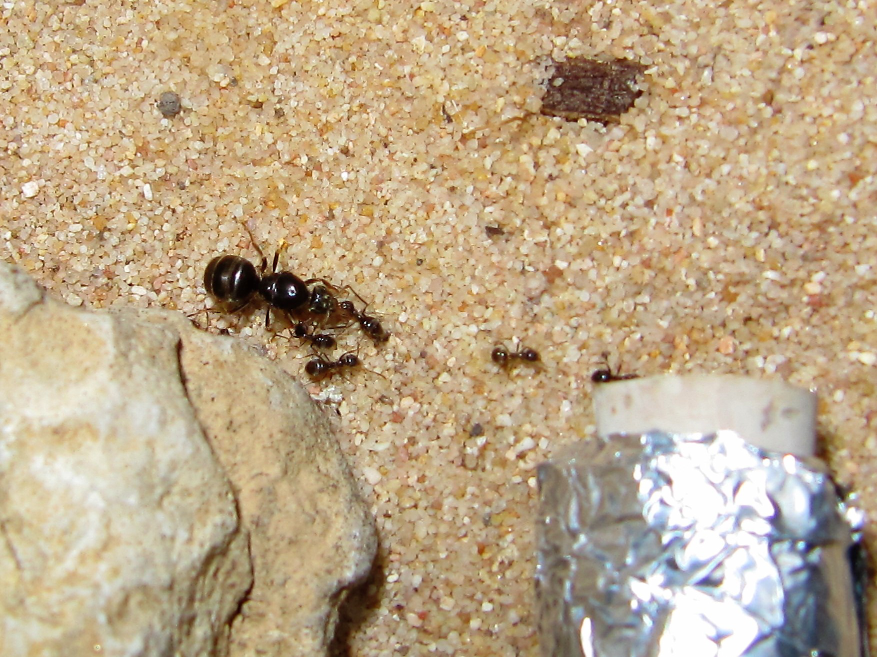 Letzte Woche kamen die Ameisen direkt aus dem Kühlschrank in eine kleine mit Sand gefüllte Arena. Ihr Reagenzglasnest blieb vorerst mit Alufolie abgedunkelt, der Eingang des Nestes mit einem Korkstopfen, der mit einer 4 mm Bohrung versehen ist, verengt. In die Arena kam zudem eine Reagenzglastränke mit Wasser.