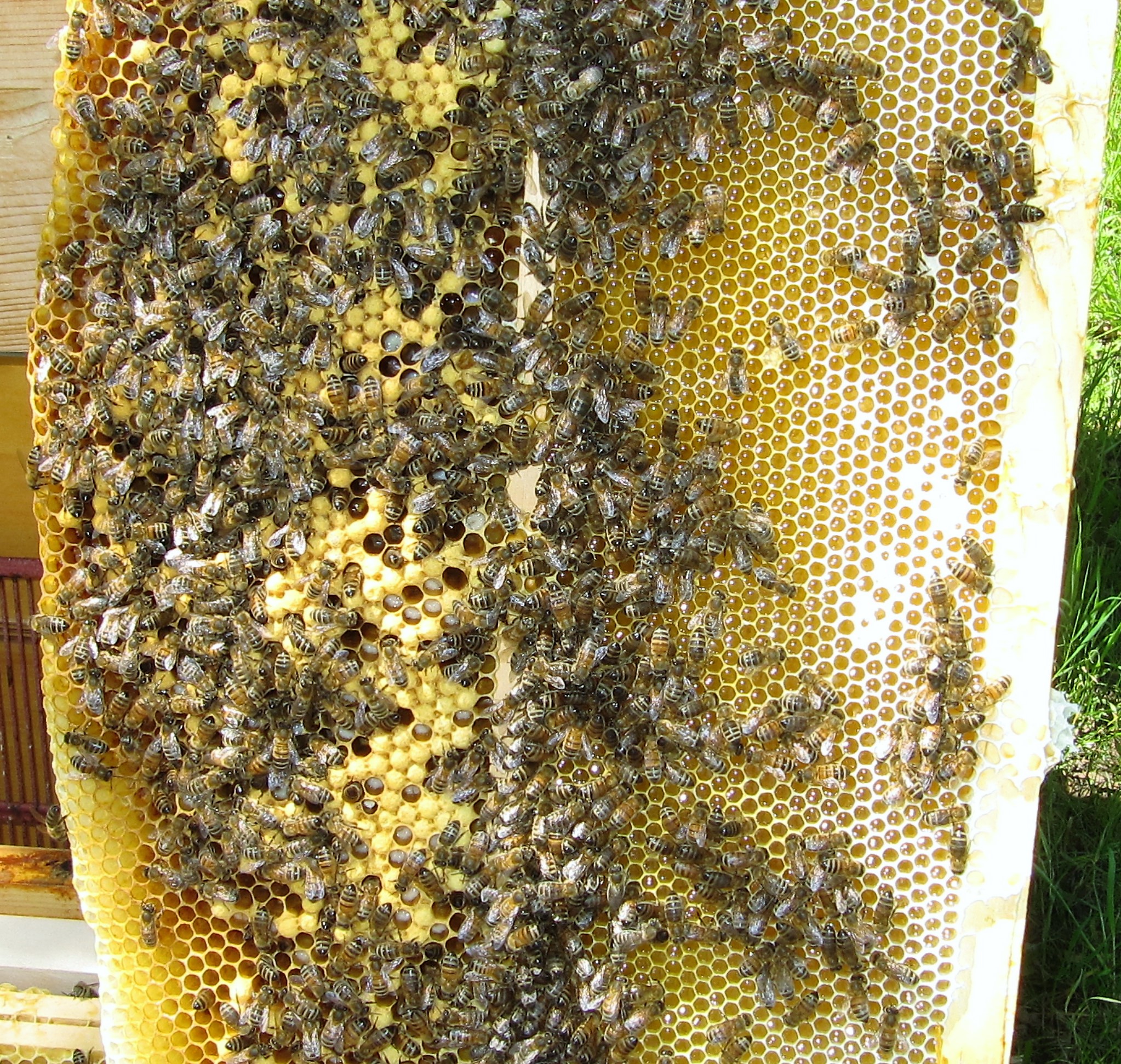 Wabe Drohnenbrut links, Honig rechts