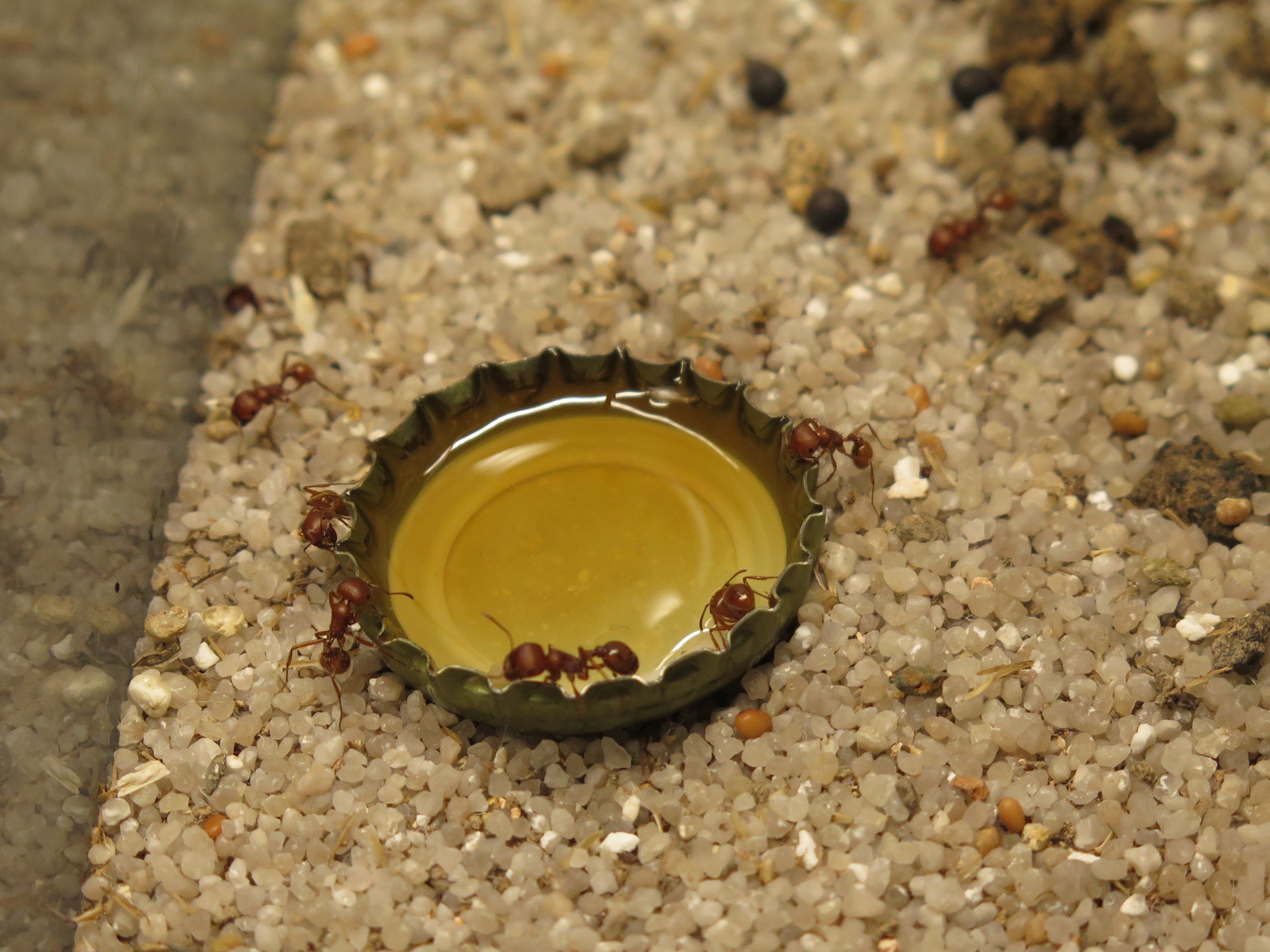 Sie zeigen im Vergleich zu anderen Ameisen nur geringes Interesse an Zuckerwasser oder Honig. Trotzdem füttere ich ab und zu Honigwasser, wobei mir nicht klar ist, ob sie sich mehr fürs Wasser als für den Honig interessieren. Wasser biete ich regelmässig in geschlossenen Tränken an.