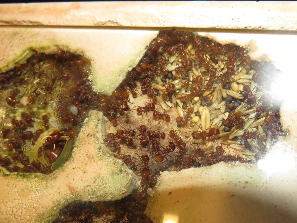 Futter: Pogonomyrmex barbatus benötigen hauptsächlich Körner (ich reiche Futtermischungen für Kanarienvögel, Löwenzahnsamen, Grassamen...) und auch tote Insekten. Sie sind zwar in der Lage, Futtertiere zu töten, sind aber sehr schlechte Jäger. Viel lieber nehmen sie frisch überbrühte Insekten an.