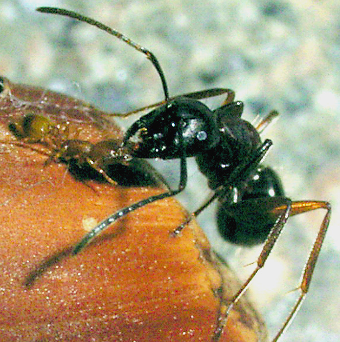 Eine Camponotus-Arbeiterin nimmt Kontakt mit einer T. unifasciatus auf. Ihre Mandibeln sind geschlossen, sie zeigt keine Aggression.