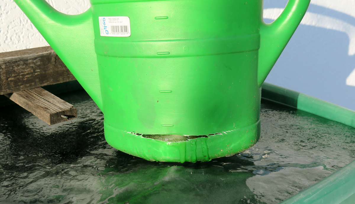 Diese 5-l-Kunststoff-Gießkanne stand gefüllt im Garten; letzte Nacht hatte es minus 8°C.