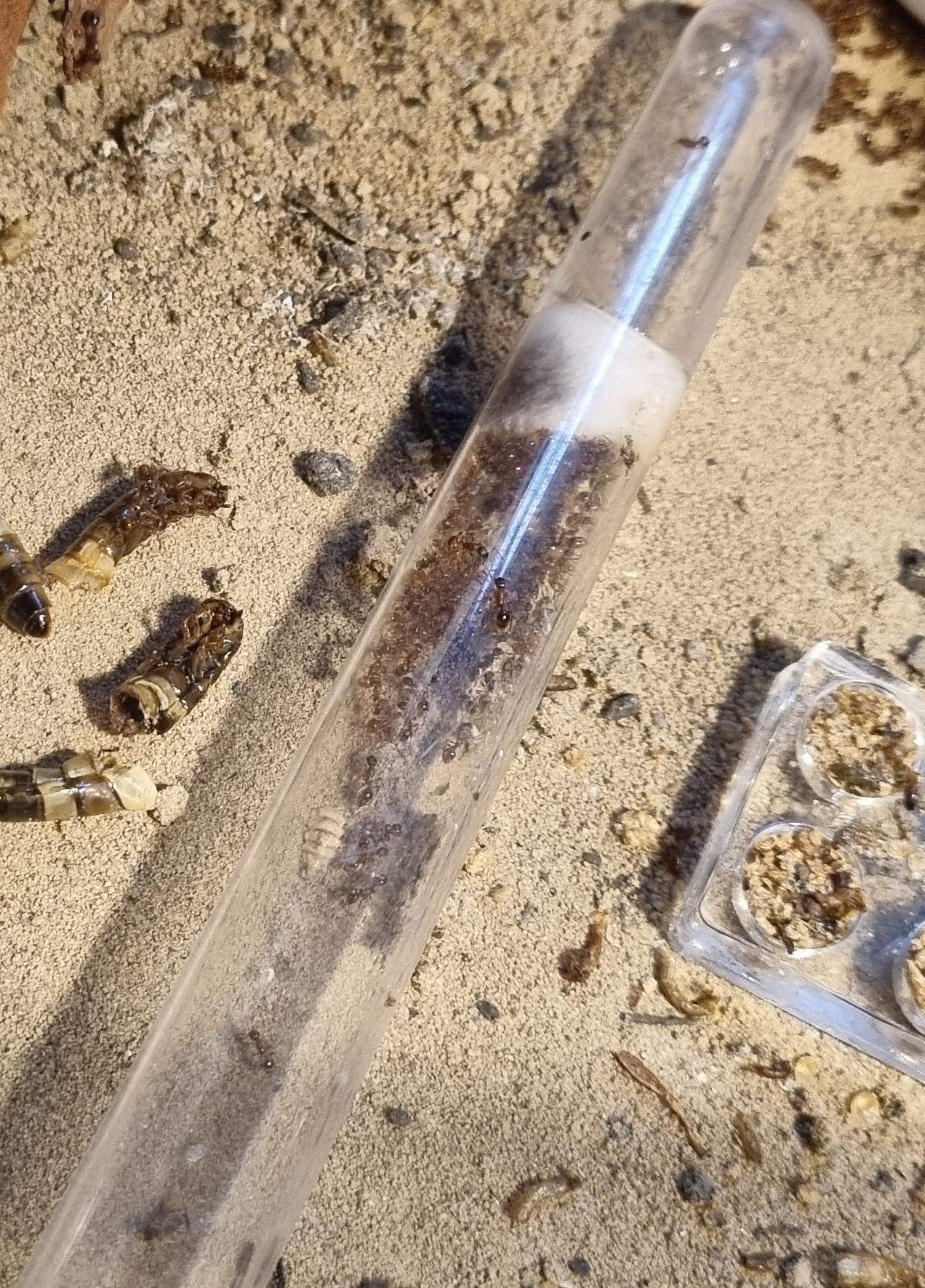 Ein "Argument" welches deine Ameisen wohl zusätzlich zu einem schnellen Umzug überzeugen würde, ist es Eingang des Reagenzglas-Eingang zu verengen. Zm Beispiel mit einem durchbohrten Korkstopfen oder mit einem kleinen Schlauch bez. einem Stück Trinkstrohhlam und etwas Watte...