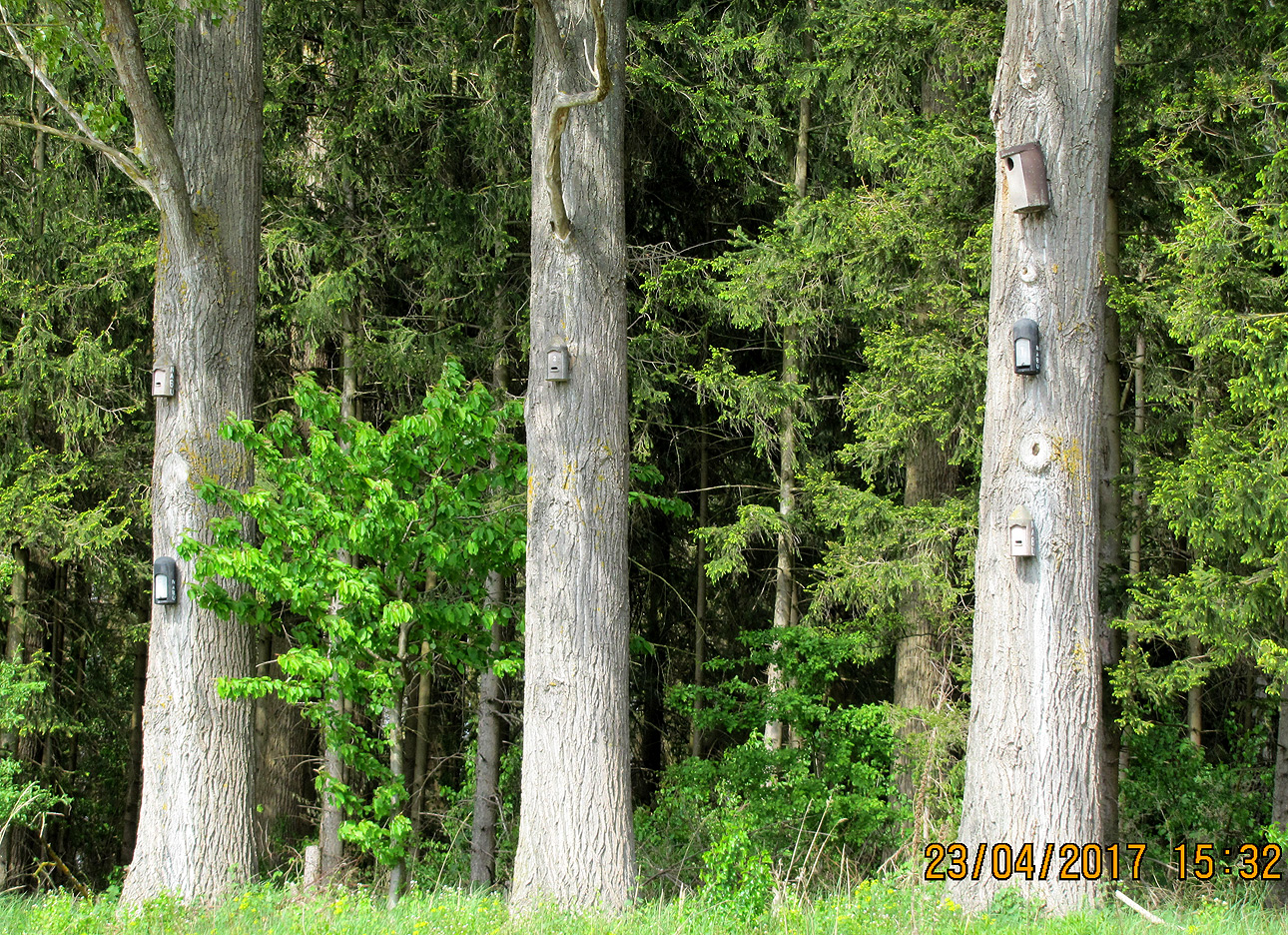 Man erkennt recht viele Nisthöhlen für Fledermäuse und Vögel. Die Reihe setzt sich nach links noch gute 100 m fort.