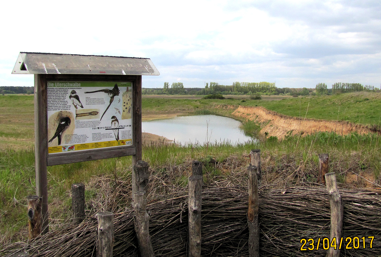 bis aufs Grundwasser eingetieft. Rechts wurde ein Steilufer angelegt, an dem die hier angekündigten Uferschwalben