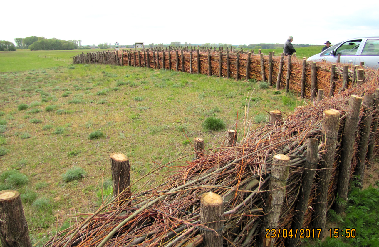 4) Der massive Flechtzaun vor dem Uferschwalben-Bereich schützt eine kleine Böschung mit Sandtrockenrasen. Im Sommer ist dort die
