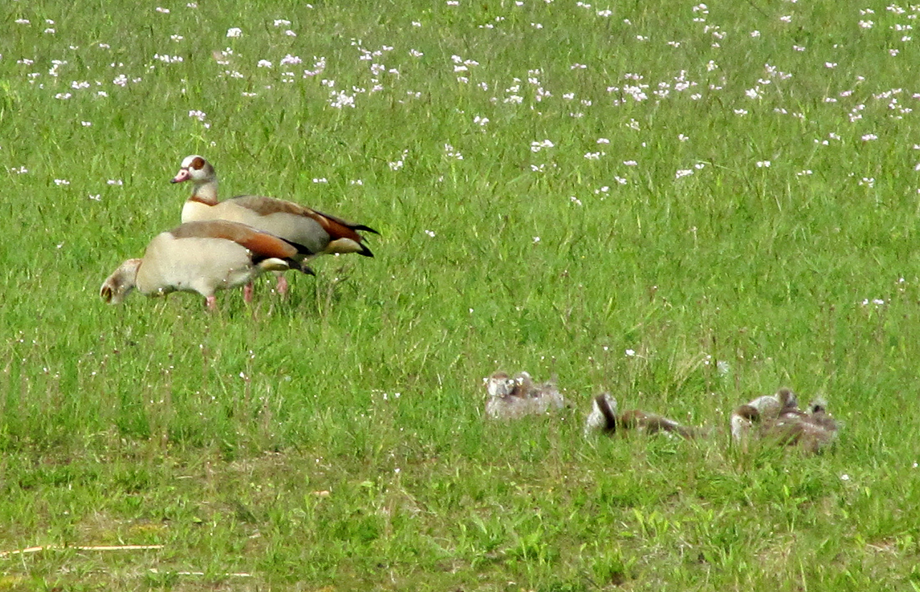 7) Die Nilgänse haben das neu angelegte Gewässer rasch erobert und führen bereits Gössel.