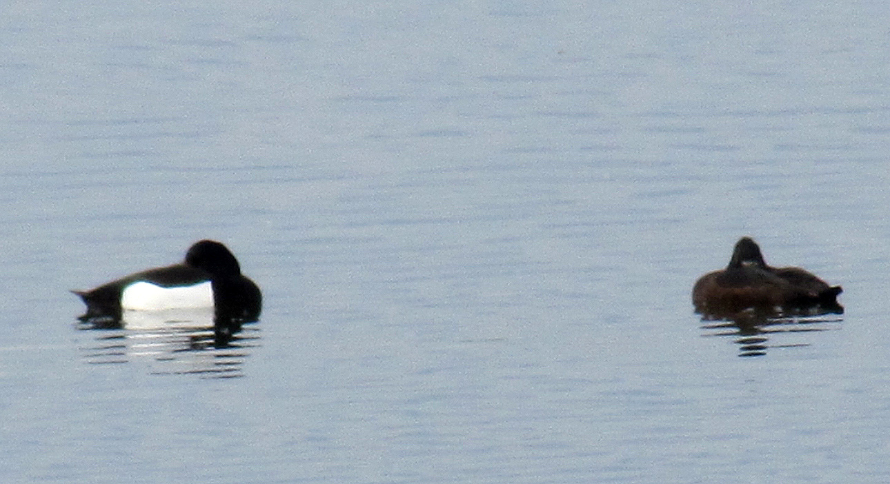 8) Auf dem Teich dümpelt ein Paar Reiherenten. Wie vor Anker lagen sie da unbeweglich dösend eine