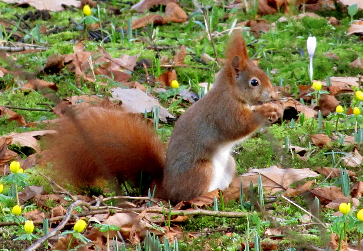 Das Eichhörnchen genießt die Sonne. Es scheint hier allerdings noch