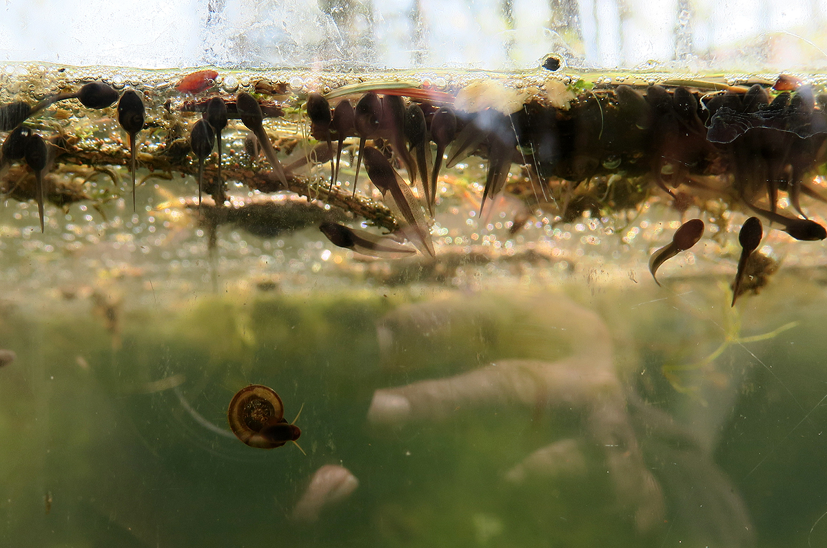 Durch die Scheibe zum Tümpel lassen sich Kaulquappen vom Grasfrosch Rana temporaria an der Wasseroberfläche beobachten, sowie eine Tellerschnecke (Planorbis sp.).
