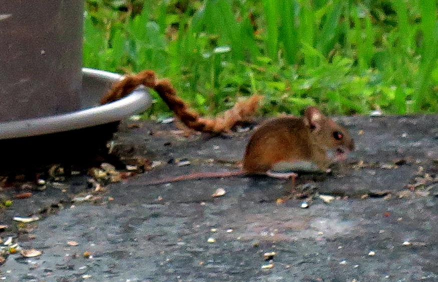 Doch seit ein paar Tagen fällt uns ein anderer Besucher auf: Ein Mäuschen saust blitzschnell vom Haus zum Vogelfutterhaus um dort herabgefallene Reste zu stibitzen.