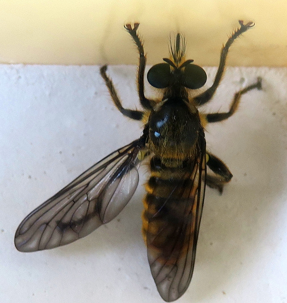 aber dann hat es die Maschine angeworfen und war weg… Klar war es eine Raubfliege, mit etwas Ähnlichkeit zu Wespen. Die Internet-Suche ergab:
