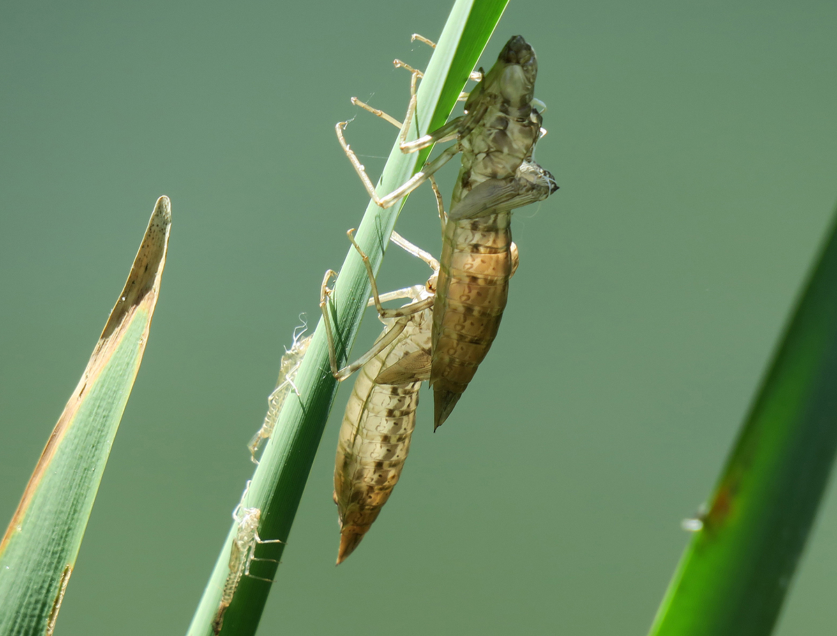 Eine ist gerade aus der Haut gefahren. Die Vorderflügel sind schon aufgepumpt, die Hinterflügel hängen noch schlaff herab.