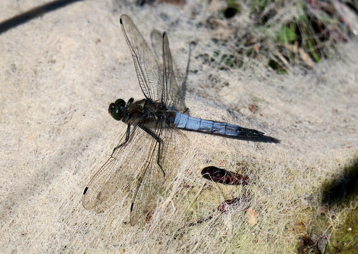 (Orthetrum cancellatum) hält auf einer getrockneten Algenmatte Ausschau nach vorbeifliegenden Weibchen.