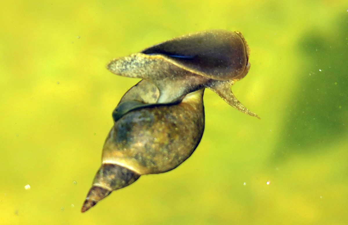Reichlich vorhanden sind wieder die Schlammschnecken (Lymnaea stagnalis). Hier eine, die mit dem Fuß an der Oberfläche hängt. Sie nehmen dort Luft in ihre Atemhöhle auf.
