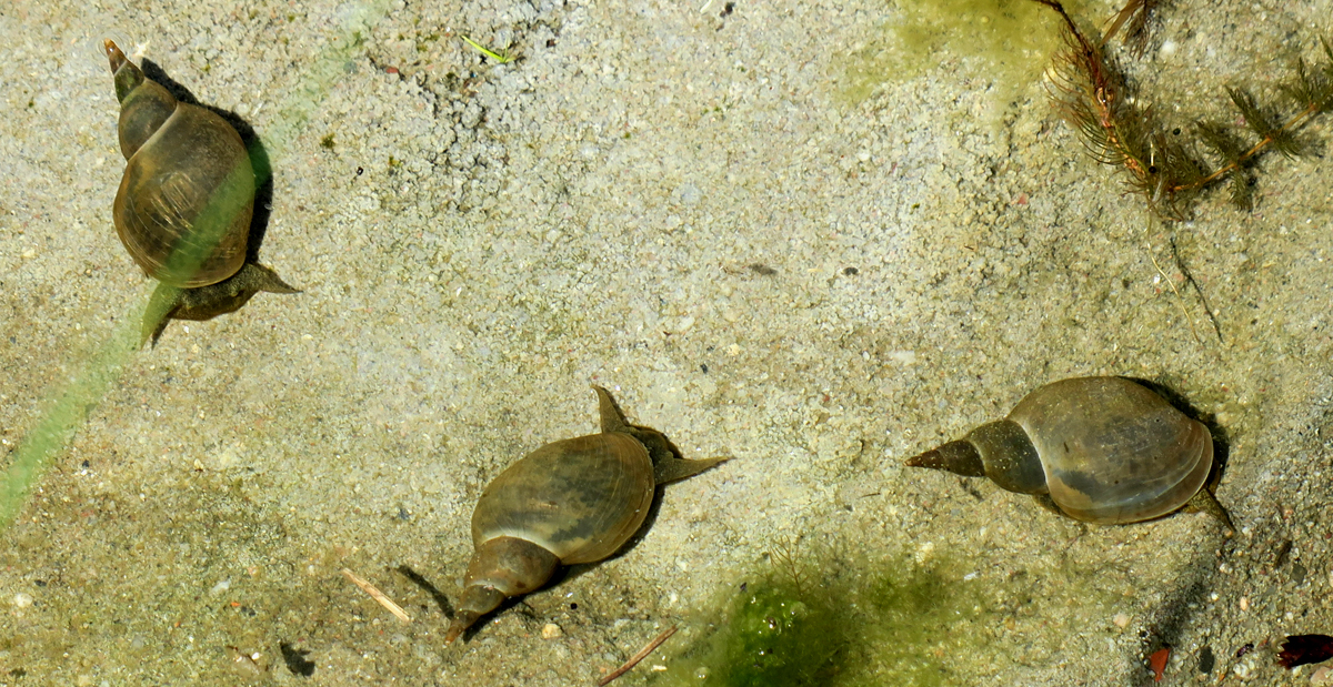 Auf einem hellen Stein unter Wasser sind gleich drei beisammen. - Diese Schnecken sind die Zwischenwirte für einen Vogel-Saugwurm. In den Schnecken entwickelt sich eine Generation von