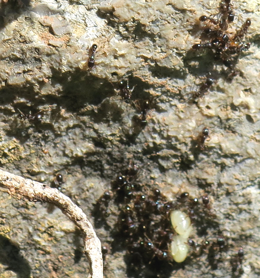 Jedenfalls war reger Verkehr zwischen dem Erdhügel und einer ca. 20 cm höhere gelegenen Spalte in der Mauer. Interessant: Im 2. Bild wird eine noch weiße Gynen-Puppe nach oben geschleppt.