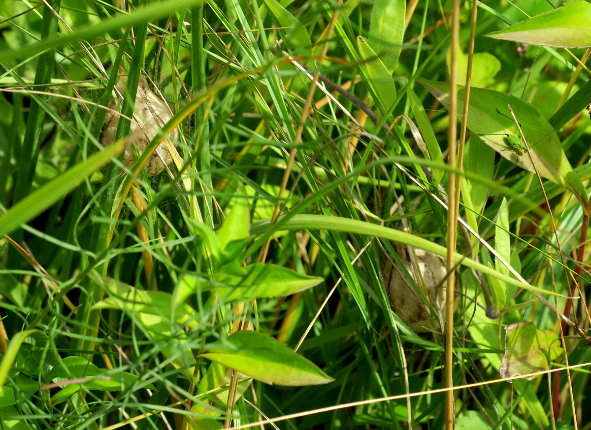 Hier ist er nochmal genauer zu sehen, umgeben von einem feinen, aber recht ungeordneten Fadengewirr, das ihn in der Vegetation verankert.
