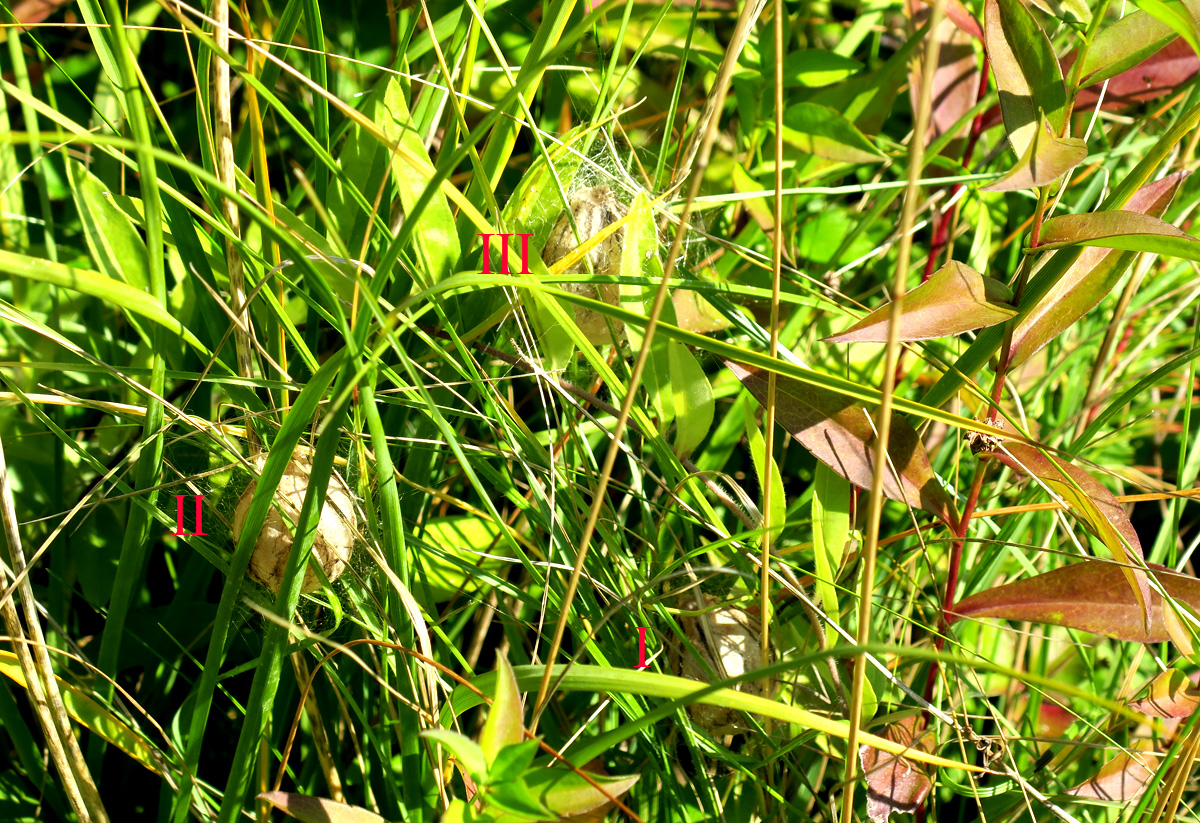 Die drei Kokons sind in der Reihenfolge ihres Erscheinens mit I, II und III markiert.