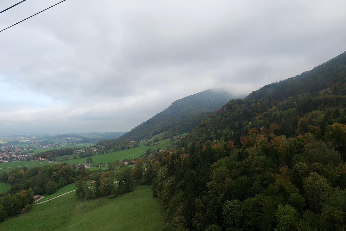 Die kleine Kabine schaukelt über die dort üppig grünen Wiesen und Wälder Richtung Wolken.