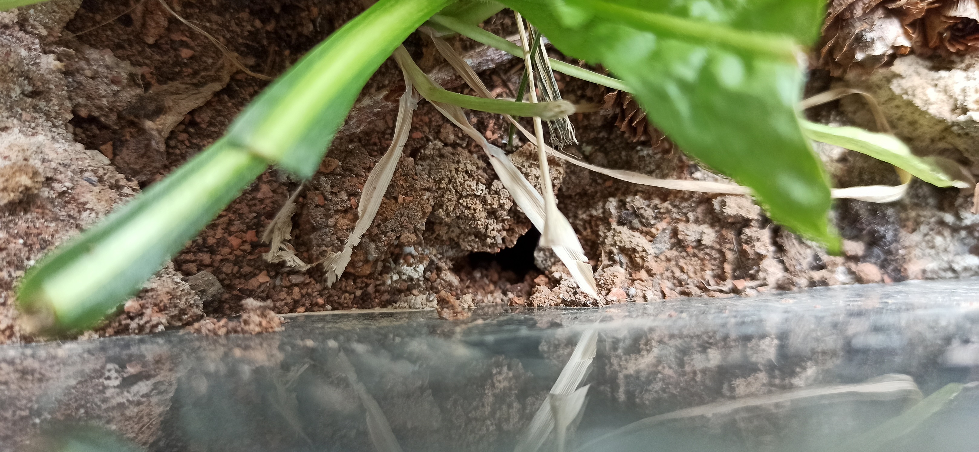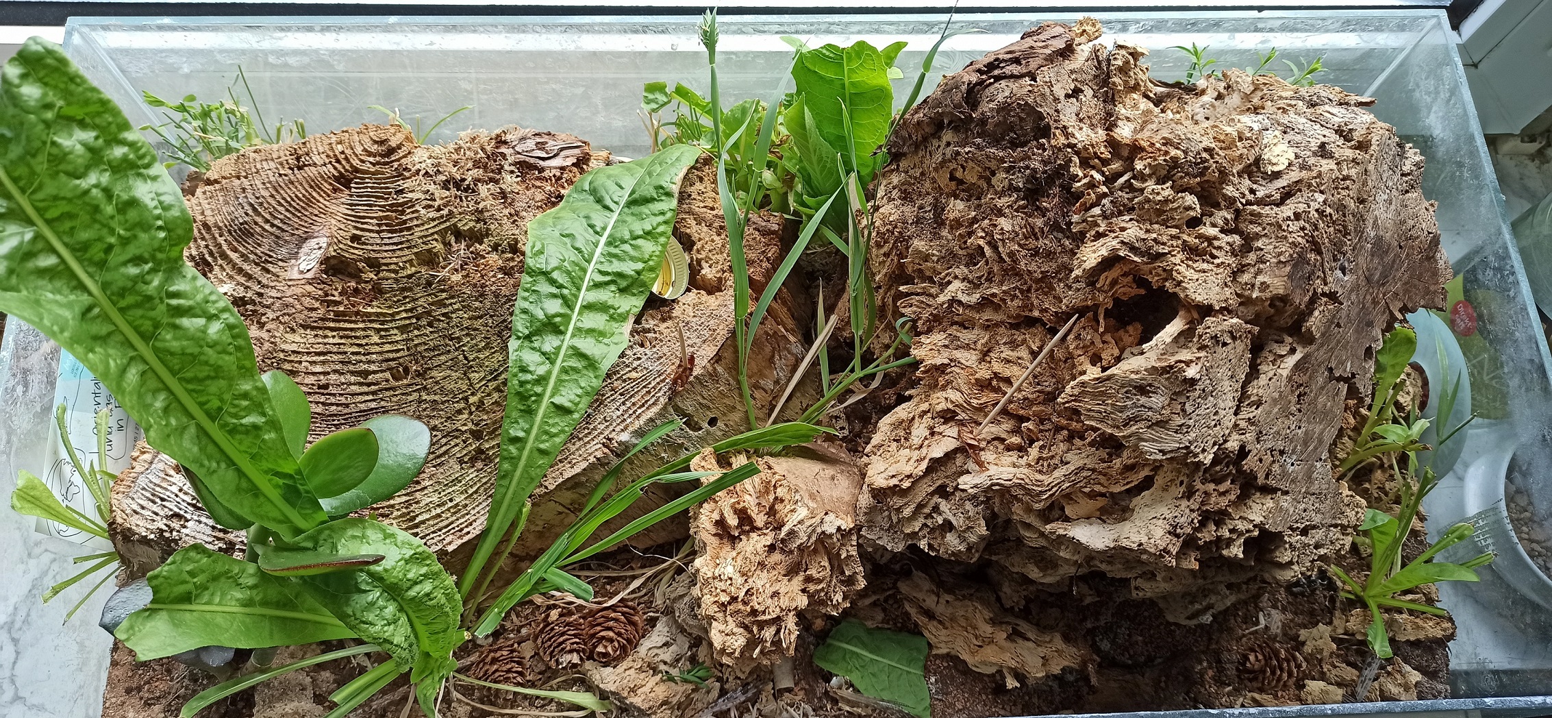 Als Erdteil dient ein Gemisch aus Sand, Lehm und Erde. Sand zum Strecken, Lehm für die Festigkeit und Erde für die Pflanzen. Das scheint sehr gut zu funktionieren. Auf den Bodengrund legte ich links die verrottende Holzscheibe und rechts den verwitterten Stumpf, der schon beim Transport fast auseinander fiel und einen eigenen Erdanteil aufweist. Beide Mitbringsel hatten erwartungsgemäß Bewohner: Springschwänze, Asseln, 2 Hundertfüßer, ein paar sehr kleine Spinnen die Netze bauen und viele ganz kleine Wesen, die ich einfach nicht ansatzweise einordnen kann. Dazu gehören auch diverse Milben usw. Ich habe alle am Leben gelassen und alle durften auch in das Formicarium. Meine Kolonie C. ligniperda, zu dem Zeitpunkt ca. 70 Tiere, wurde Zugang gewährt. Sie konnten sich den Zeitpunkt des Umzugs aussuchen. Zusätzlich habe ich noch Samen essbarer Gartenpflanzen eingestreut und natürlich auch diverse kleine Pflanzen aus dem Wald bekamen mit dem Umzug ihre Chance.