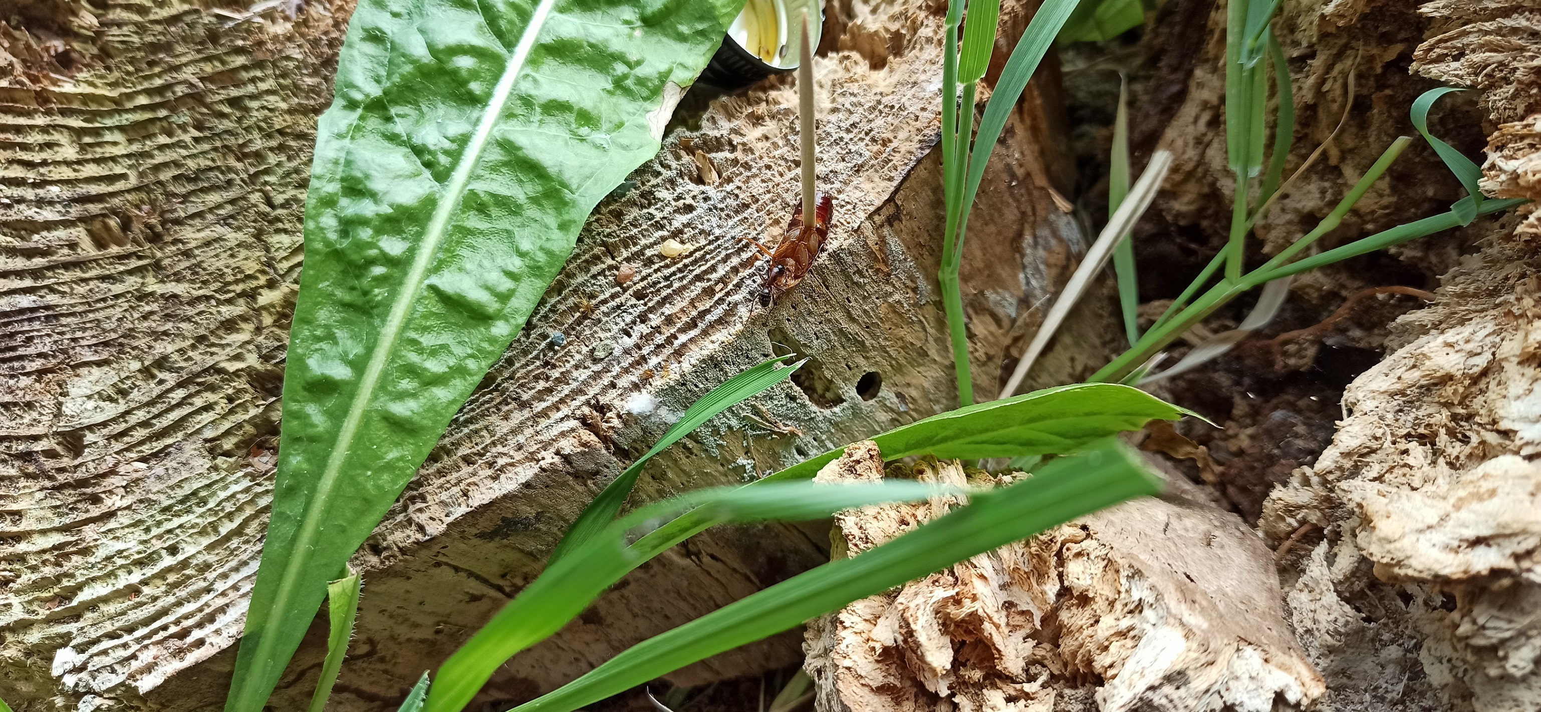 Wie ich es eingerichtet habe: Ich habe mir einen Mischwald am Rande der Stadt angeschaut, der zwar forstwirtschaftlich und als Naherholungsgebiet genutzt wird, jedoch eine ausgeprägte Streuschicht und einen ordentlichen Anteil an Totholz aufweist. Der Wald hat Nadel- sowie Laubbaumabschnitte. Je nach Zeitpunkt der Anpflanzung ist der Wald teils sehr schattig und dicht, teils aber auch sehr licht. In einem solchen lichten Abschnitt konnte ich Camponotus cf. ligniperda beobachten. Für die Einrichtung des Formicariums habe ich Material aus dem Wald verwendet. Die anwesenden Forstarbeiter waren damit einverstanden, dass ich zwei verrottende Holzteile mitnehme. Davon gibt es in dem Wald reichlich.