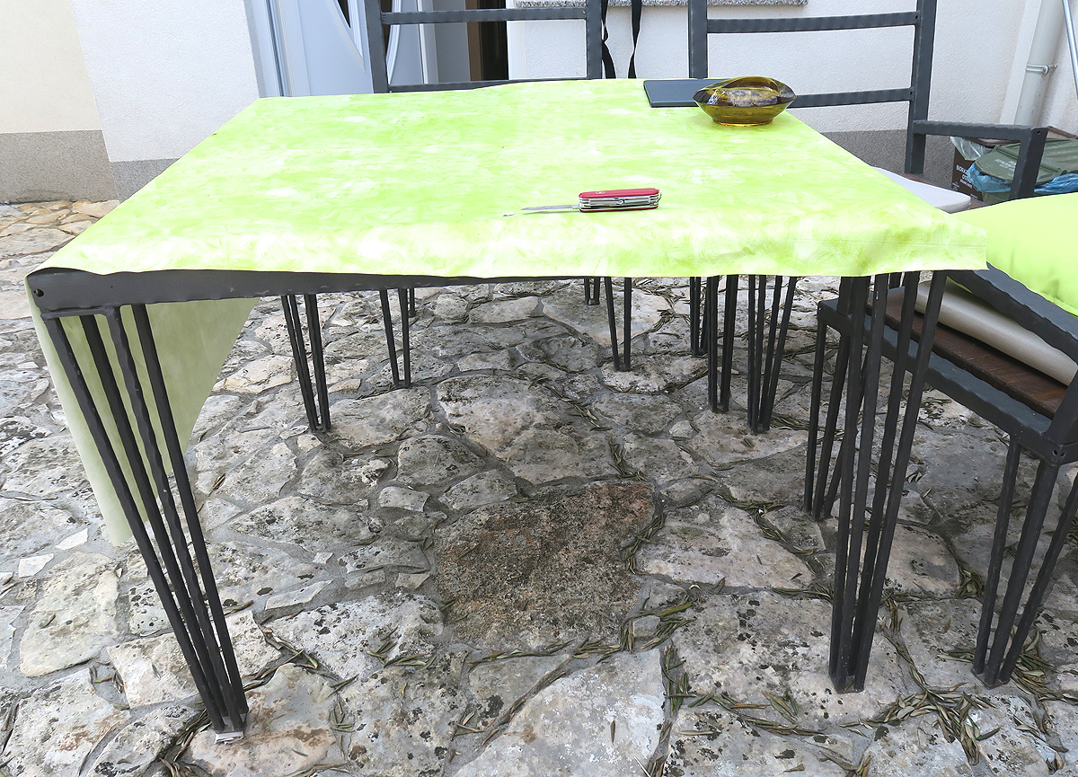 eigentlich nur am Rand der Terrasse im Boden liegen. Die Tischdecke wurde immer wieder vom Wind abgehoben, der Rand