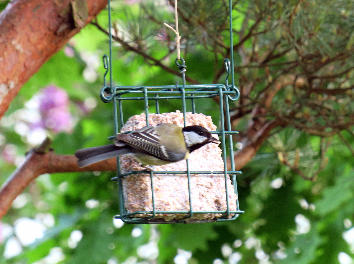 Soll man Vögel im Sommer füttern? Oder werden sie dann so verwöhnt, dass sie die normale Futtersuche vergessen? - Eine für lange Zeit kontrovers diskutierte Frage. Ich kann nur Einzelbeobachtungen vorbringen. Bei unseren Kohlmeisen und den Blaumeisen konnte ich in diesem Frühjahr recht ausgiebig verfolgen, wo sie Futter sammelten, für sich selbst und für die Brut. Das „Fast Food“ wird zwar ausgiebig besucht, aber dazwischen sieht man immer wieder, wie die Vögelchen an den Kieferzweigen turnen und offenbar Blatt- oder Rindenläuse absammeln, die es da in Massen gibt. Das „natürliche“ Futter ist sichtlich weiterhin beliebt. Und so rasch wird wohl eine seit Jahrmillionen ererbte und von der Selektion belohnte Futterwahl nicht aufgegeben!