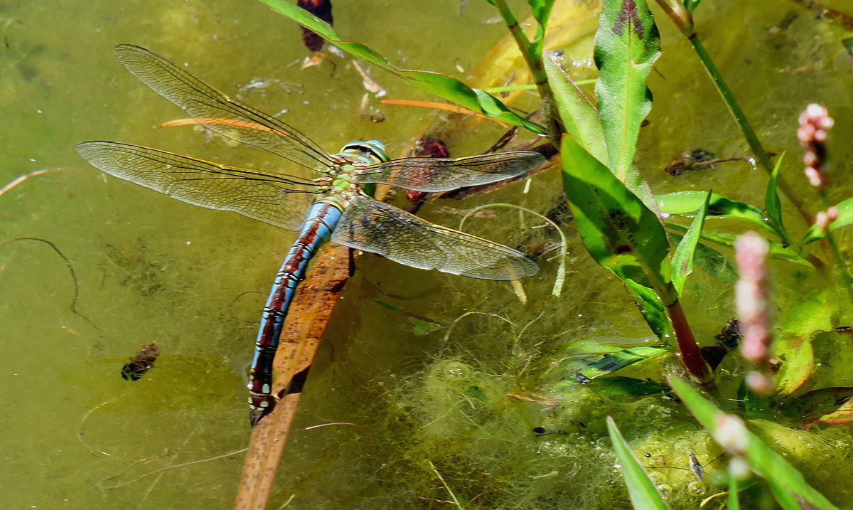 Ein Weibchen der "Großen Königslibelle" (Anax imperator) legt Eier in ein welkes, treibendes Blatt.