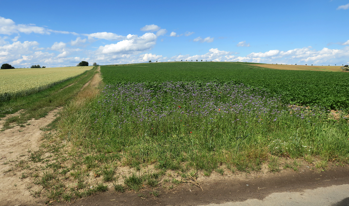 Kilometerweit schweift der Blick über Felder, hier links Getreide, rechts Kartoffeln. Eine kleine Ecke vorn ist als „Blühwiese“ mit v. a. Bienenweide (Phacelia)