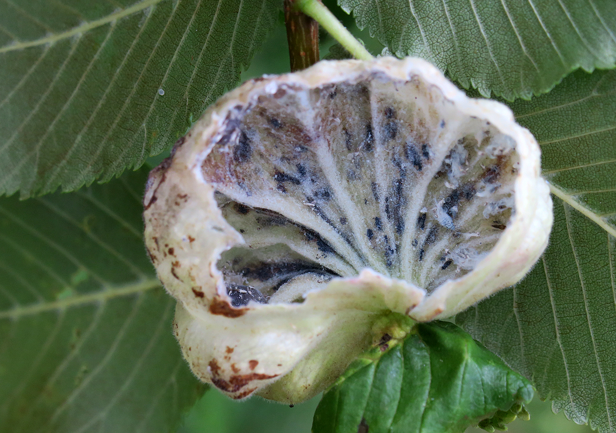 Innen leben zahlreiche graue Läuse, umgeben von Wachswolle. Auch Honigtau produzieren sie; aus einer zweiten solchen Galle tropften ca. 2 ml davon ab!