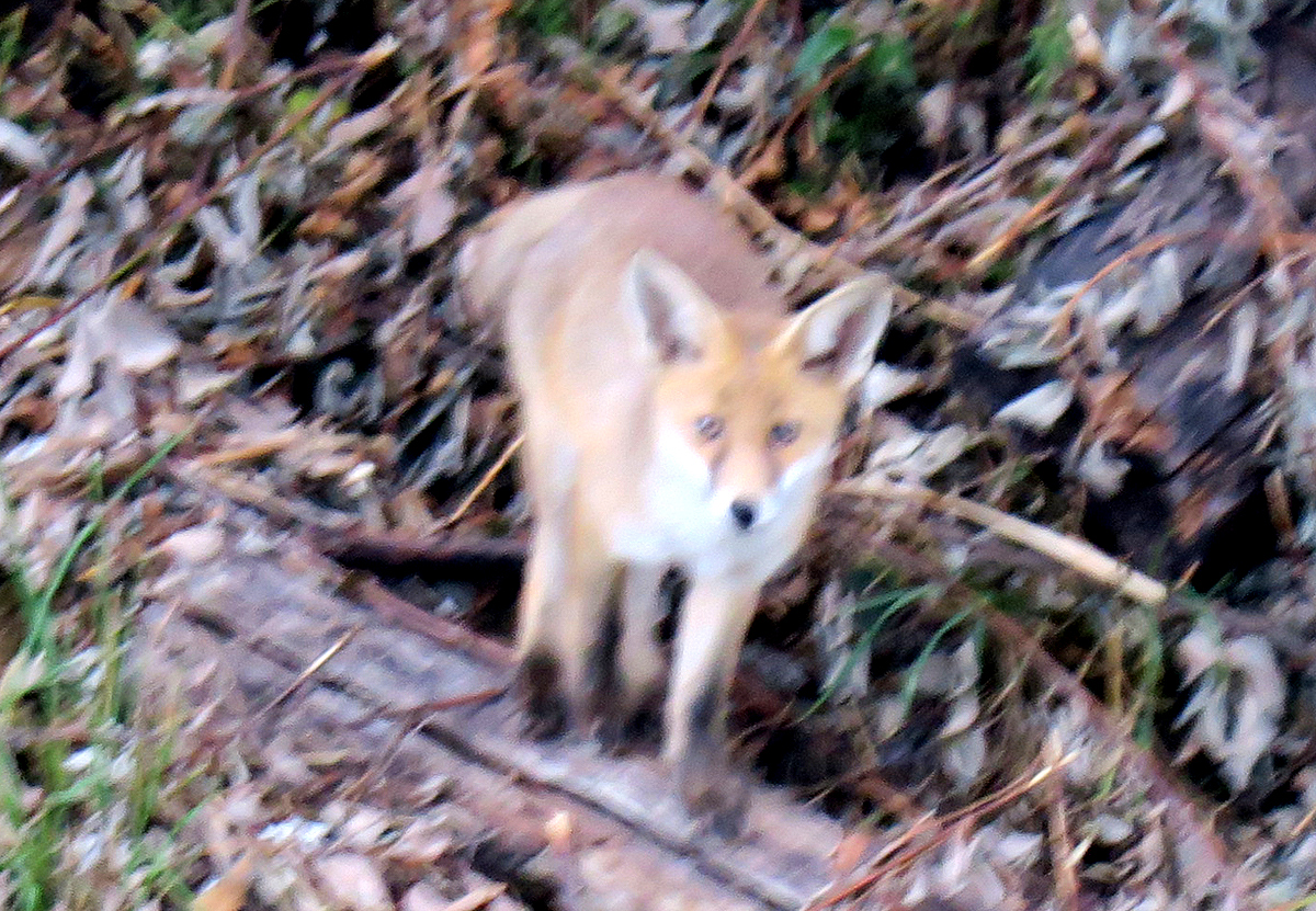 Ganz zum Schluss blickt von jenseits der Bahngleise ein junger Fuchs herüber! Er war weit weg, weshalb das Foto suboptimal ist. Aber das Tier hat auch nicht