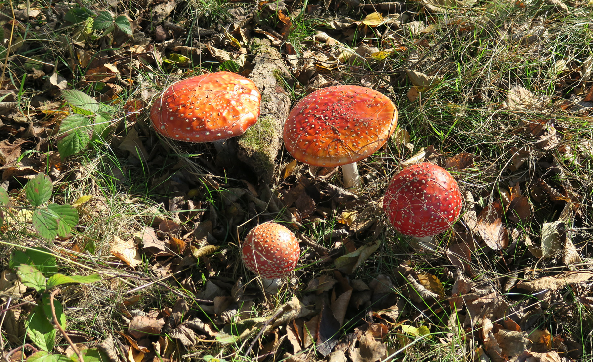 Nach einem ersten Blick auf einige entfernt weidende Pferde fielen fielen uns zunächst am Wegrand unter einer alten Birkenallee zahlreiche Gruppen von Fliegenpilzen auf, eine schöner als die andere!