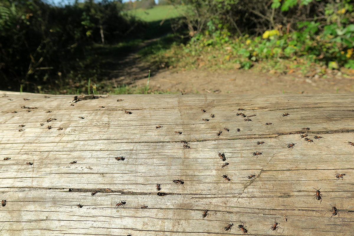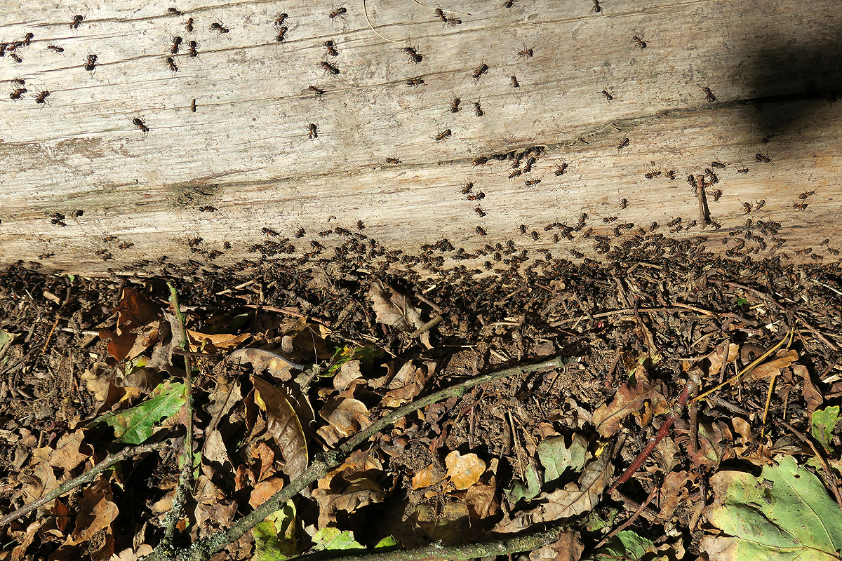 Es sind Speichertiere, im Sommer erst geschlüpfte junge Arbeiterinnen, die dank reichlicher Fütterung viel Fettgewebe entwickeln. Larven sind zu dieser Zeit ja nicht mehr zu versorgen. Im Frühjahr, bei der Sonnung, werden diese Speicher aktiviert; die neuen, aus Eiern der Königinnen geschlüpften Lärvchen werden mit Drüsensekreten von den Speichertieren ernährt. In genügend großen Völkern werden daraus Geschlechtstiere aufgezogen. Die Speichertiere werden vom freien Ende des Baumstamms, von der Ansammlung der Ameisen aus, in Richtung Gestrüpp am anderen Ende getragen. Anscheinend hat das Volk im Sommer den gut besonnten Baumstamm bewohnt (und das Erdreich darunter), und verlagert sich jetzt in ein Winternest im Gestrüpp. Das war so unzugänglich, dass ich dieses Nest nicht lokalisieren konnte. Aber derartige Verlagerung von Nestern im Jahresrhythmus sind bei Waldameisen nicht unüblich.