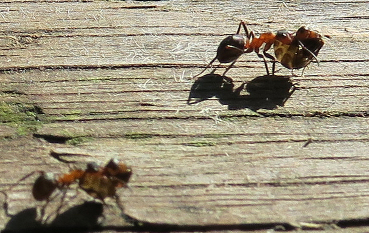 Doch einige Ameisen schienen irgend etwas zu tragen. Dank heller Sonne war es schwer von ihrem Schatten zu unterscheiden, und es ging hin und her!