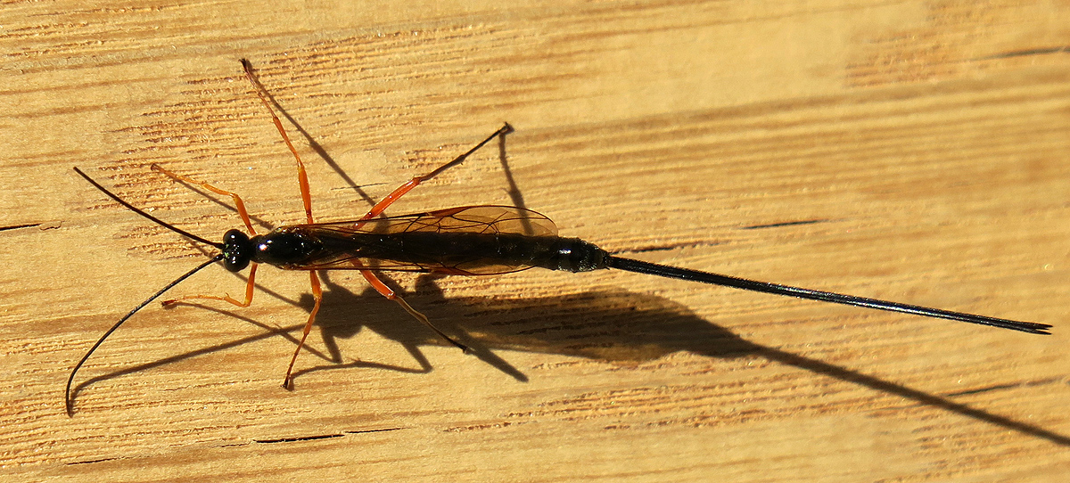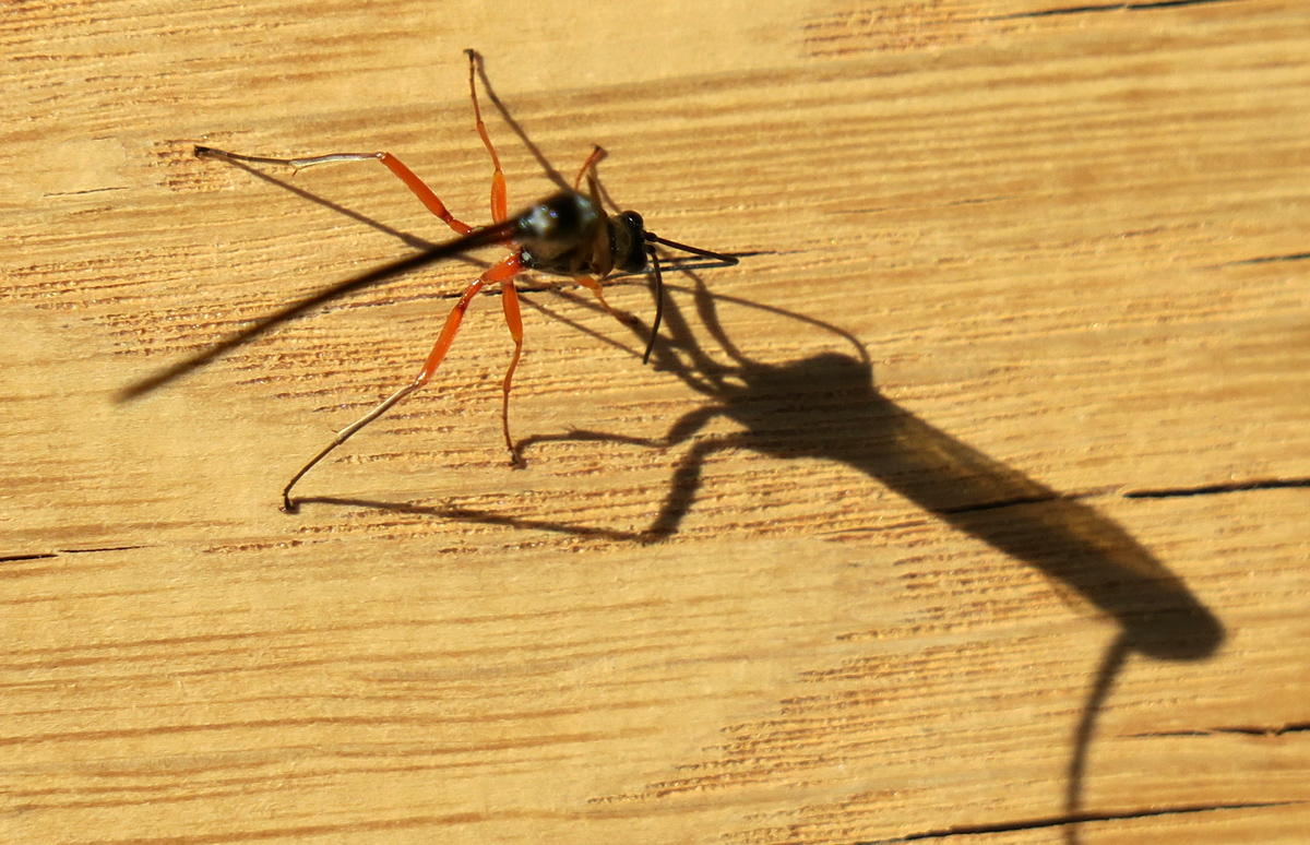 Im vorigen Bild hat sie tatsächlich versucht, ihren Legestachel in das Holz einzubohren. Nun beim Weiterlaufen wird es deutlich, wobei ich bisher die Gattung und Art nicht bestimmen konnte.