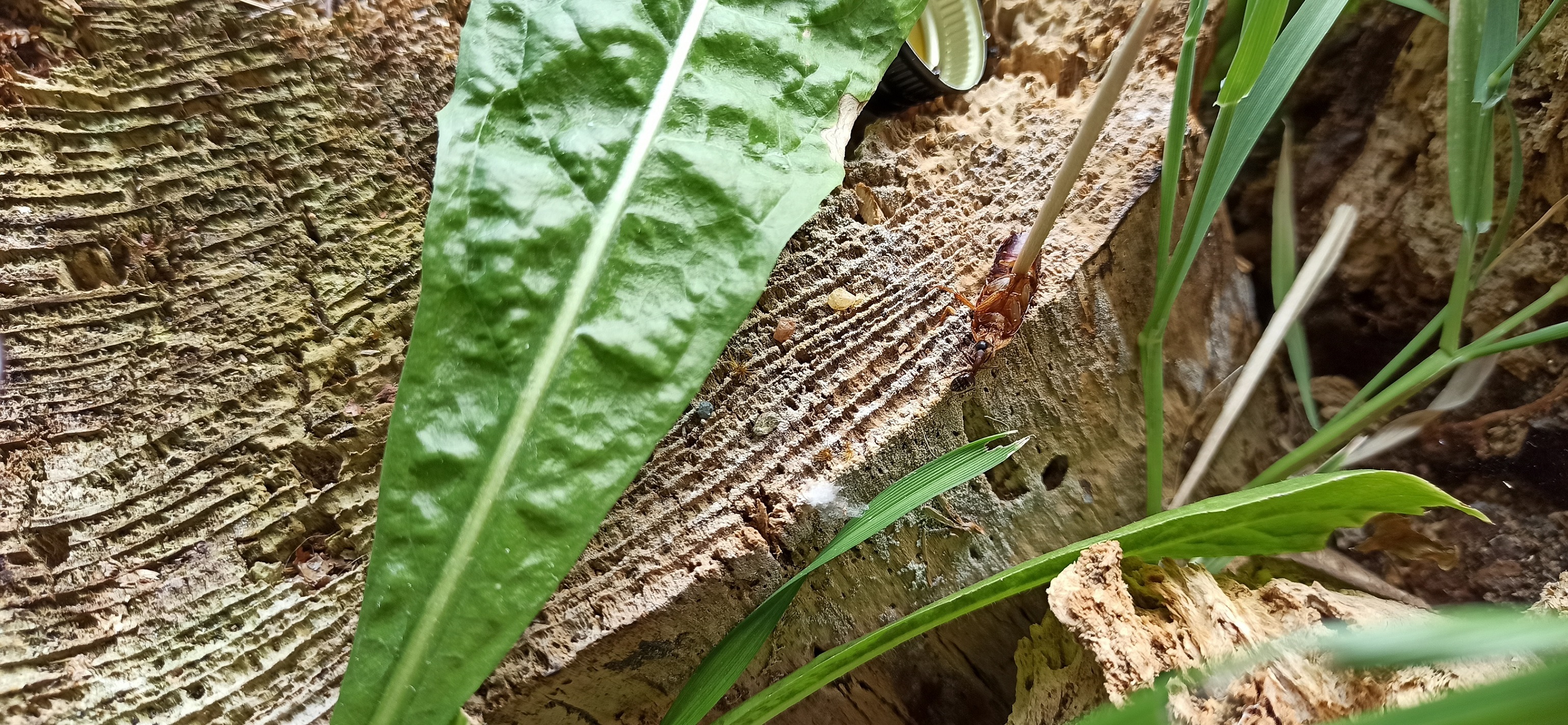 Als Erdteil dient ein Gemisch aus Sand, Lehm und Erde. Sand zum Strecken, Lehm für die Festigkeit und Erde für die Pflanzen. Das scheint sehr gut zu funktionieren. Auf den Bodengrund legte ich links die verrottende Holzscheibe und rechts den verwitterten Stumpf, der schon beim Transport fast auseinander fiel und einen eigenen Erdanteil aufweist. Beide Mitbringsel hatten erwartungsgemäß Bewohner: Springschwänze, Asseln, 2 Hundertfüßer, ein paar sehr kleine Spinnen die Netze bauen und viele ganz kleine Wesen, die ich einfach nicht ansatzweise einordnen kann. Dazu gehören auch diverse Milben usw. Ich habe alle am Leben gelassen und alle durften auch in das Formicarium. Meine Kolonie C. ligniperda, zu dem Zeitpunkt ca. 70 Tiere, wurde Zugang gewährt. Sie konnten sich den Zeitpunkt des Umzugs aussuchen. Zusätzlich habe ich noch Samen essbarer Gartenpflanzen eingestreut und natürlich auch diverse kleine Pflanzen aus dem Wald bekamen mit dem Umzug ihre Chance.