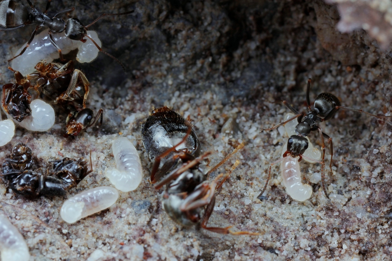 Hallo MBM! Ich hoffe, ich darf mich da einschalten! Bei der deutlich aggressiveren Formica fuscocinerea findet man häufig "Müllhalden", aber nicht nur außerhalb des Nestes, sondern auch im Inneren. Von Sauberkeit und Hygiene scheinen die lieben Tierchen wenig zu halten. Es dreht sich vorwiegend um andere Ameisenarten, in einem Fall um Manica rubida, die nur im Einzelkampf gegen Serviformica erfolgreich sein kann, gegen die blitzschnellen und sehr kooperativen Serviformica haben die Manica keine Chance. Die Nester von Manica werden in vielen Fällen durch andauernde Belagerung der Nestöffnungen buchstäblich ausgehungert. Leider habe ich damals keine Proben der vielen "schwarzen" Ameisenleichen zur Bestimmung mitgenommen.