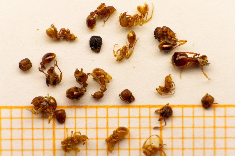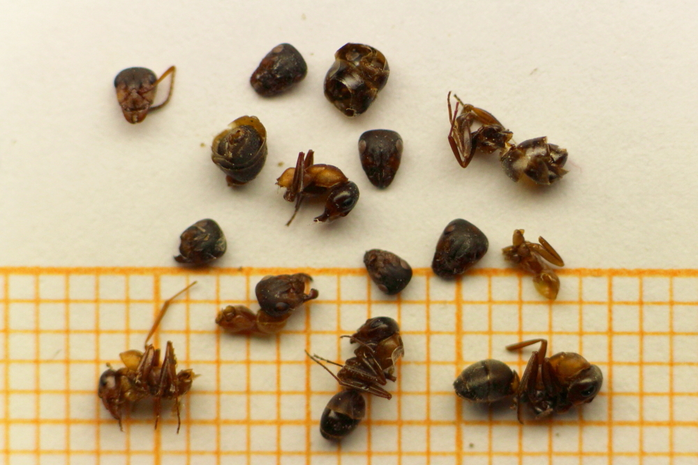 Die besterhaltenen Stücke hier auf Millimeterpapier heraussortiert. Ganz vereinzelt sind auch Arbeiterinnen von Solenopsis fugax dabei. Die könnten ja eventuell auch aus anderen Gründen aus dem Formica-Nest herausgeworfen worden sein?