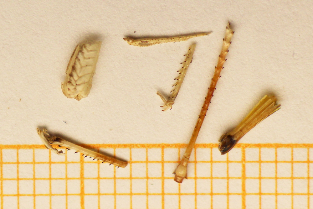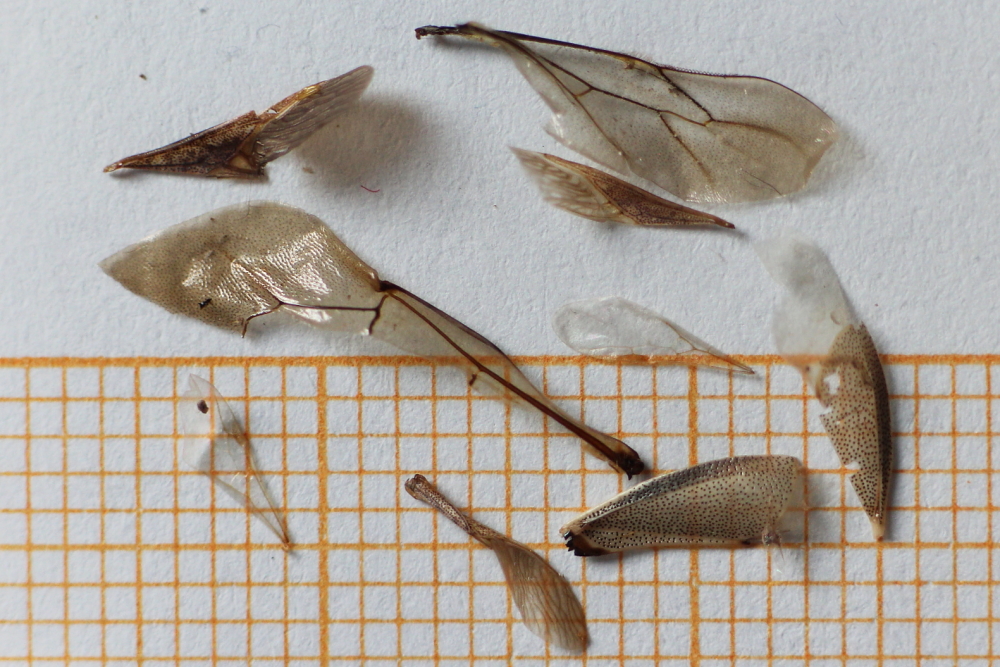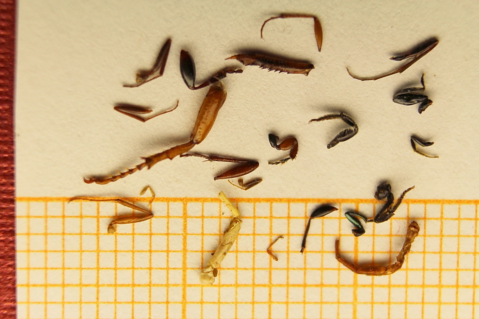 Anders verfahren sie mit dem Bruststück von Fluginsekten, wie die vielen abgetrennten Thorax-Rückenplatten (Tergite) belegen.