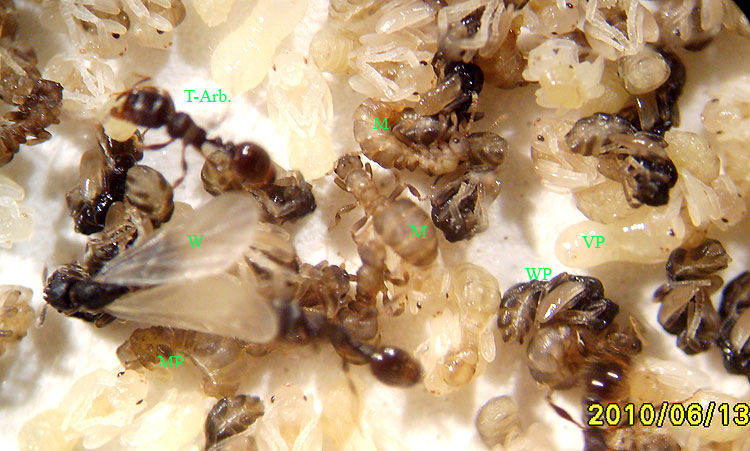 Die Männchen dieser Art sind „pupoid“, also puppenähnlich, ungeflügelt, nur schwach pigmentiert und ziemlich unbeholfen. Das obere der beiden gekennzeichneten Männchen, in Seitenansicht, ist aber bereits bemüht, mit einer Weibchenpuppe zu kopulieren! Das klappt natürlich nicht, aber bald wird sie ja schlüpfen. Man brauchtauch als Ameisenmännchen ein wenig Geduld! ;)